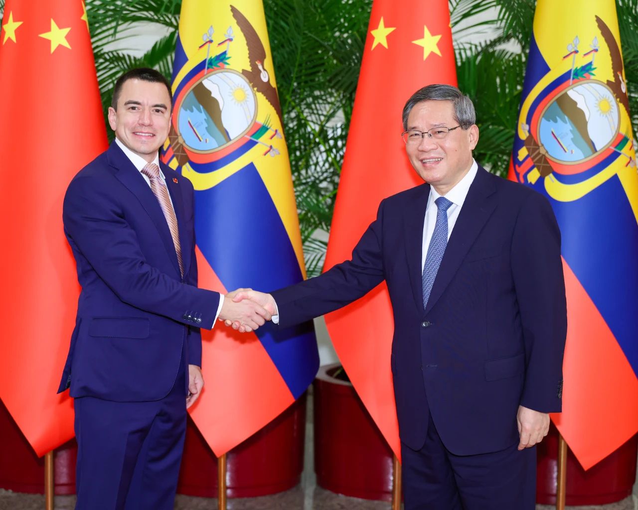 國(guó)務(wù)院總理李強(qiáng)6月24日上午在北京人民大會(huì)堂會(huì)見(jiàn)來(lái)華出席夏季達(dá)沃斯論壇的厄瓜多爾總統(tǒng)諾沃亞。