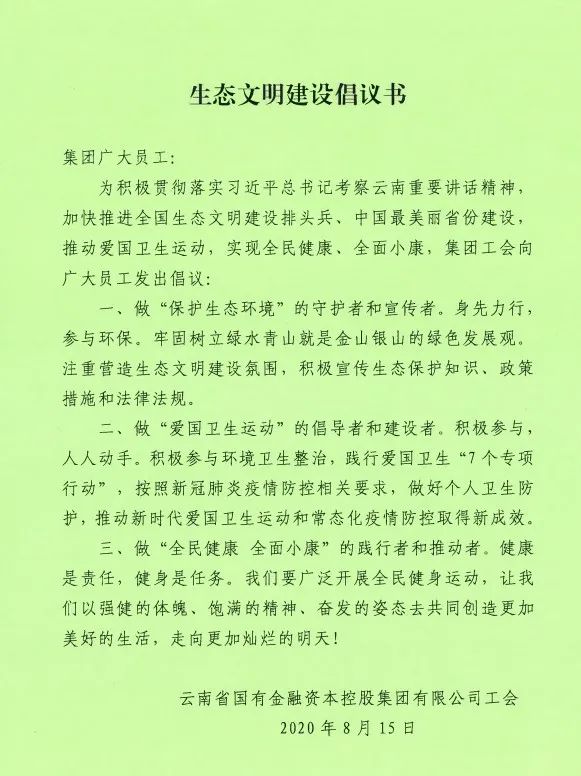 2020年8月15日,是習(xí)近平總書(shū)記提出“綠水青山就是金山銀山”理念15周年的日子。集團(tuán)工會(huì)以此為契機(jī),在海埂大壩組織開(kāi)展了以“全民健康 全民小康”為主題的健步走活動(dòng),發(fā)起生態(tài)文明建設(shè)倡議,鼓勵(lì)和引導(dǎo)集團(tuán)廣大員工參與體育健身活動(dòng),提高身體素質(zhì),人人參與愛(ài)國(guó)衛(wèi)生運(yùn)動(dòng)。集團(tuán)領(lǐng)導(dǎo)和集團(tuán)本部員工積極參與了此次活動(dòng)。