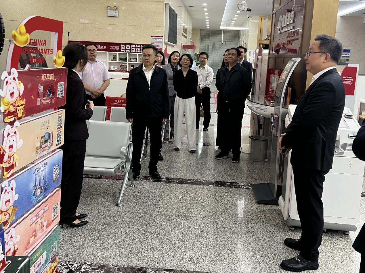 葉智勇總裁一行在招商銀行昆明分行冀華行長(zhǎng)、胡冠軍副行長(zhǎng)等陪同下參觀了招商銀行昆明分行營(yíng)業(yè)部,實(shí)地了解了招商銀行昆明分行的業(yè)務(wù)開展情況,參觀了招商銀行金融主題教育文化走廊、抓黨建促扶貧等工作進(jìn)展。雙方還圍繞下一步深化合作進(jìn)行了交流。