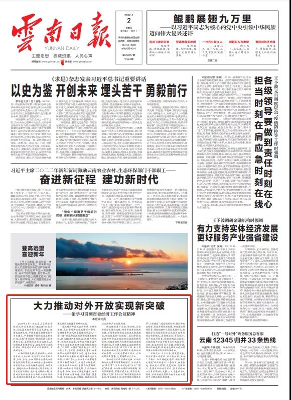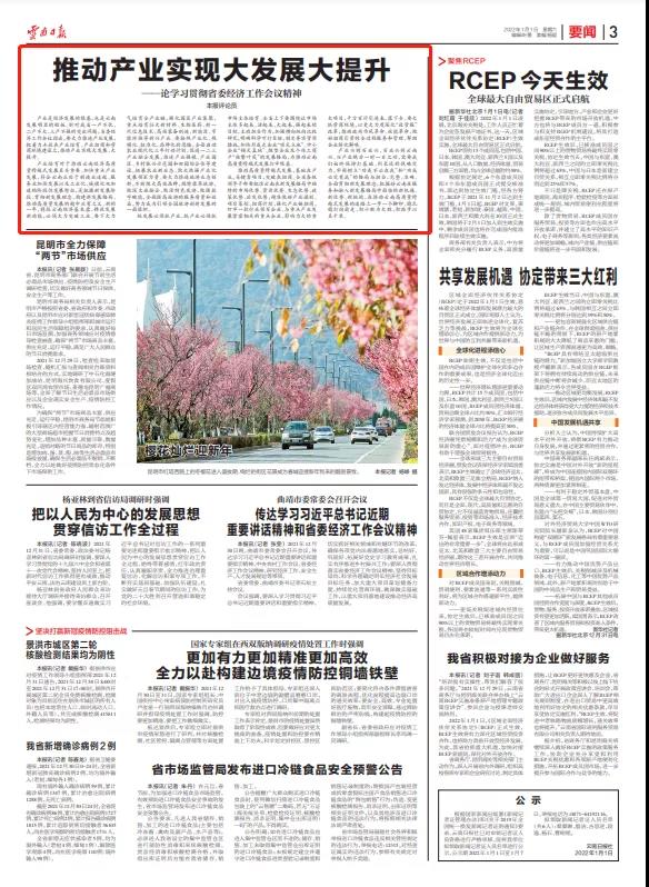2022年1月1日凌晨,《區(qū)域全面經(jīng)濟(jì)伙伴關(guān)系協(xié)定》(RCEP)生效實(shí)施,全球最大自由貿(mào)易區(qū)正式啟航。隨著RCEP生效、中國(guó)東盟全面戰(zhàn)略伙伴關(guān)系建立、中老鐵路等國(guó)際大通道加快打通,云南“東引西聯(lián)”的獨(dú)特區(qū)位優(yōu)勢(shì)更加凸顯。省委經(jīng)濟(jì)工作會(huì)議指出,我們要統(tǒng)籌發(fā)展和安全,在堅(jiān)決守好邊境的同時(shí),推進(jìn)對(duì)外開放邁出新步伐、實(shí)現(xiàn)新突破。