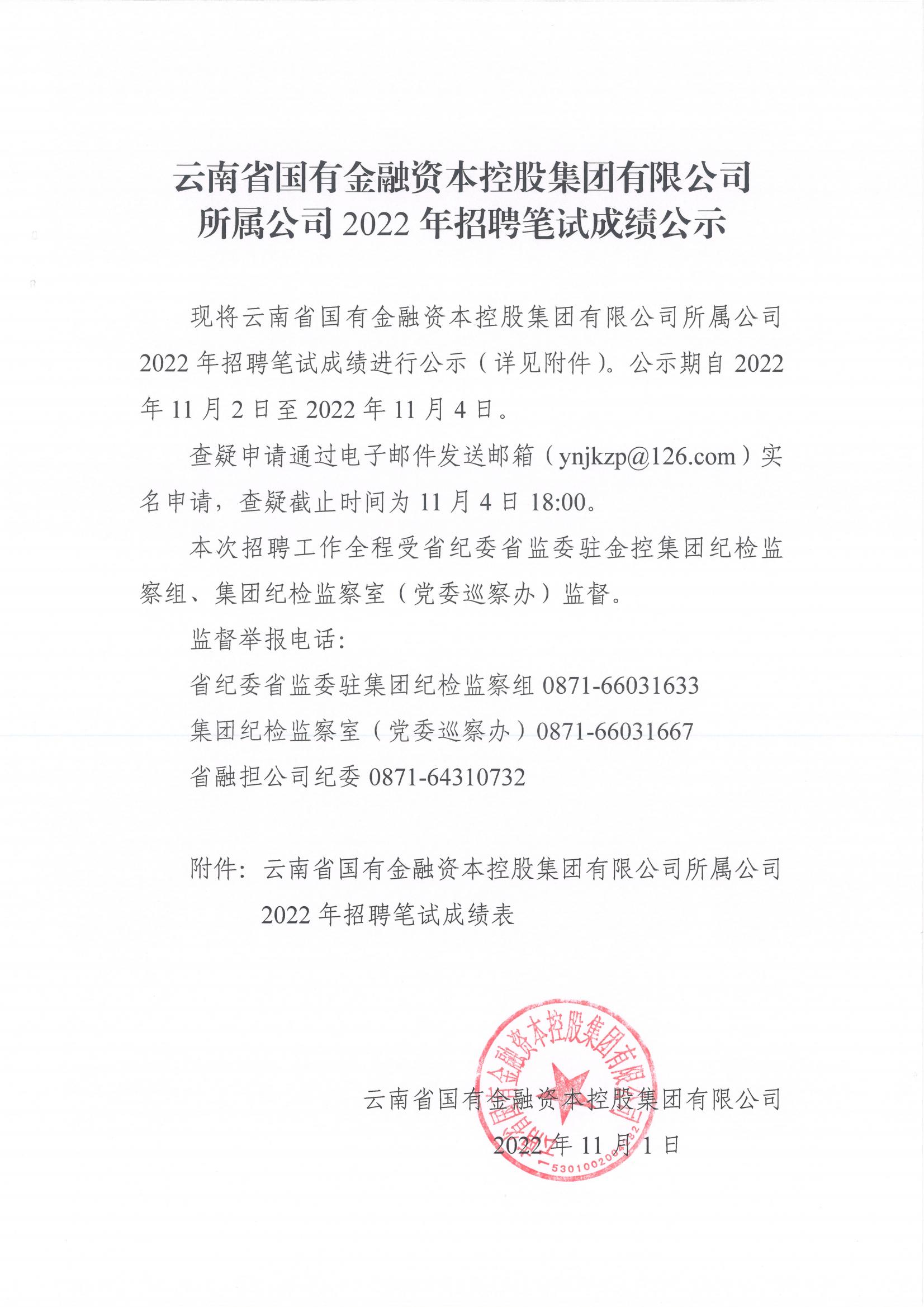 云南省國(guó)有金融資本控股集團(tuán)有限公司所屬公司2022年招聘筆試成績(jī)公示