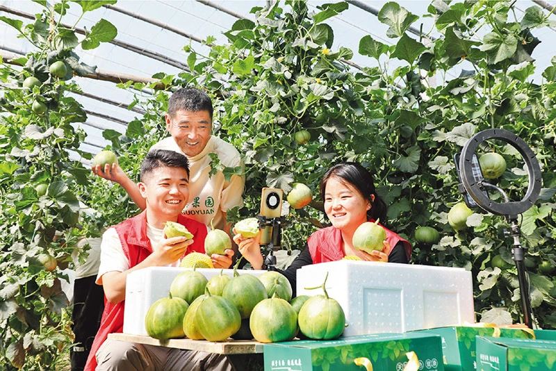 各地黨員、干部大力發(fā)揚(yáng)密切聯(lián)系群眾的作風(fēng),立足崗位擔(dān)當(dāng)作為、服務(wù)群眾。圖為2025年5月11日,河南省新鄉(xiāng)市延津縣南秦莊村甜瓜種植大棚內(nèi),黨員志愿者通過(guò)現(xiàn)場(chǎng)直播,幫助農(nóng)戶推銷甜瓜。 人民圖片 張燕/攝