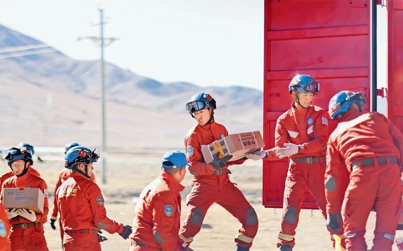 新時代以來,廣大青年在搶險救災前線沖鋒陷陣,在黨和人民最需要的時刻沖得出來、頂?shù)蒙先?,展現(xiàn)出自信自強、剛健有為的精神風貌。2025年1月7日,西藏自治區(qū)日喀則市定日縣發(fā)生6.8級地震。圖為1月9日西藏自治區(qū)森林消防總隊派出的救援人員在地震重災區(qū)日喀則市拉孜縣拉孜鎮(zhèn)措布村卸載救災物資。新華社記者 姜帆/攝