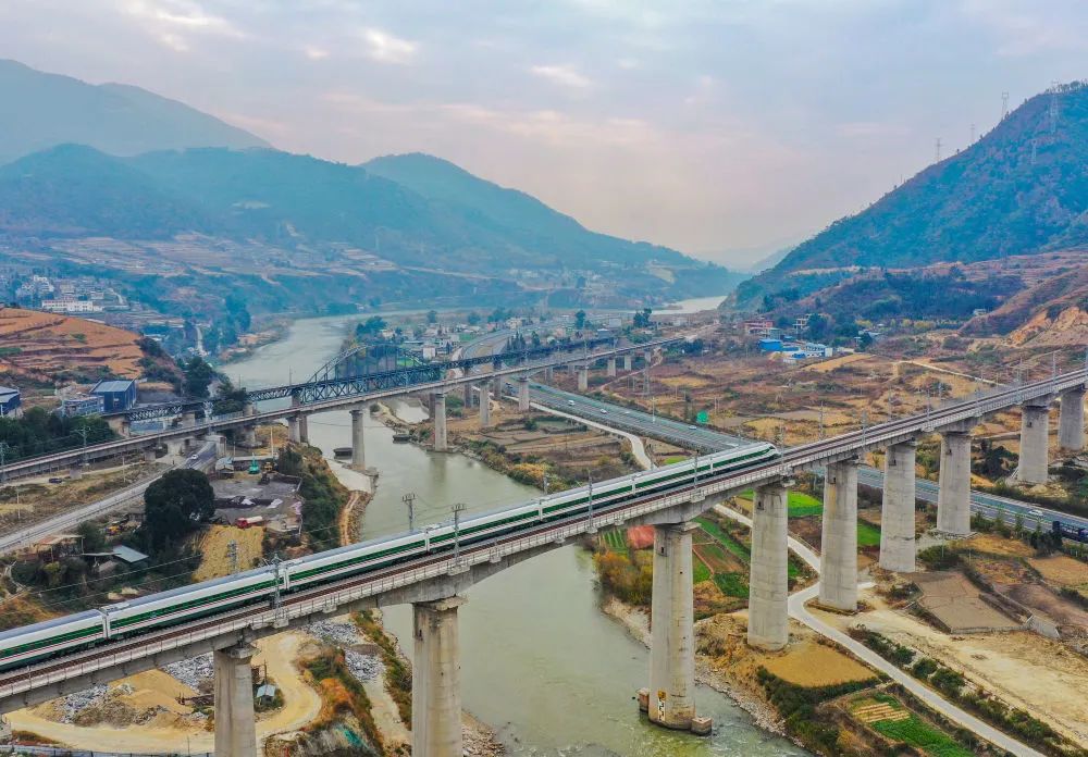 一列復(fù)興號(hào)動(dòng)車組在四川省冕寧縣境內(nèi)的新成昆鐵路進(jìn)行開通運(yùn)營前的試跑,遠(yuǎn)處是老成昆鐵路(無人機(jī)照片,2022年12月24日攝)。新華社記者 王曦 攝