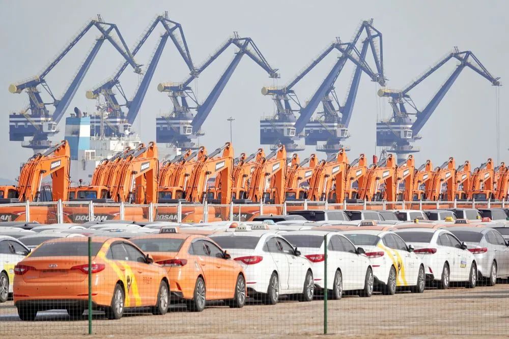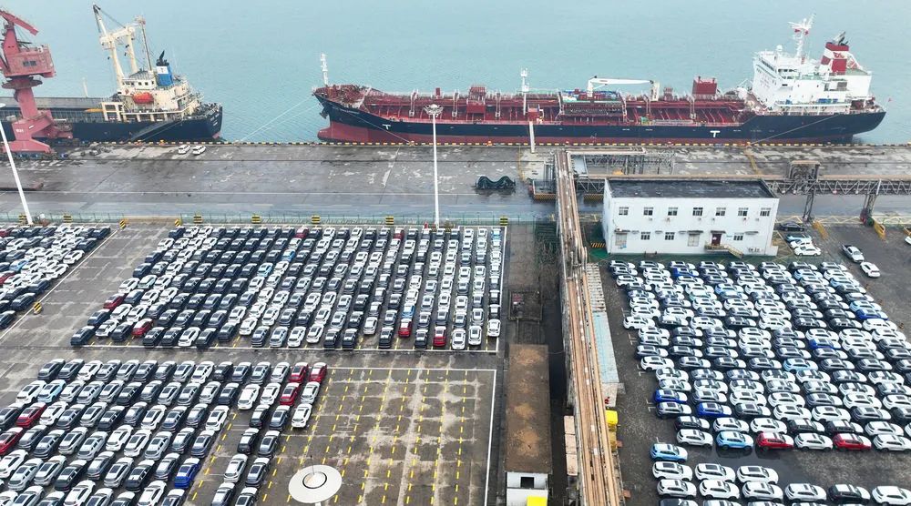在江蘇連云港港口碼頭,一批國產(chǎn)小汽車在等待裝船出口海外(無人機(jī)照片,1月13日攝)。新華社發(fā)(耿玉和 攝)