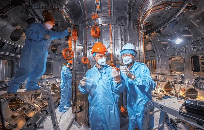2022年10月,新一代“人造太陽”等離子體電流突破100萬安培(1兆安),創(chuàng)造了中國可控核聚變裝置運行新紀錄。圖為2022年4月,中核集團科技人員在新一代“人造太陽”真空室內(nèi)解決安裝調(diào)試過程中的技術(shù)難點。 中核集團供圖 王雨萌/攝