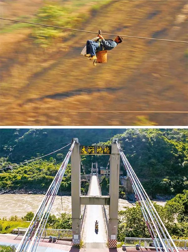 ?“過江靠溜索”曾是怒江兩岸群眾出行的重要方式。2013年,國家實施“溜索改橋”項目,幫助西部邊遠山區(qū)群眾結(jié)束溜索時代,怒江州怒江段上溜索被改造為各式跨江橋梁,完成了沿江人民“天塹變通途”的企盼。上圖為2013年2月2日,在云南省怒江州瀘水市六庫街道,一名居民背著背簍溜索過江(新華社記者 王長山/攝)。下圖為2022年9月13日,瀘水市居民騎摩托車通過大興地橋(無人機照片,新華社記者 江文耀/攝)。
