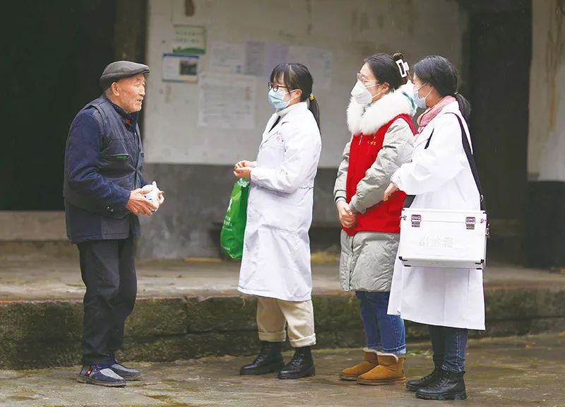 2022年12月28日,在貴州赤水市石堡鄉(xiāng)興農(nóng)村,醫(yī)護(hù)人員和黨員志愿者為村民提供送藥上門(mén)服務(wù),在新冠疫情防控進(jìn)入轉(zhuǎn)段階段后,積極發(fā)揮好基層醫(yī)療第一道防線作用。 新華社發(fā) 王長(zhǎng)育/攝