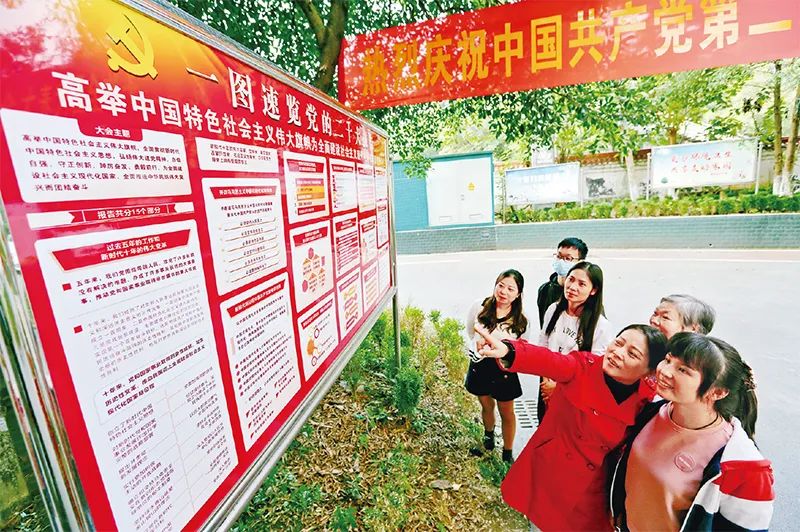 ?圖為2022年10月18日,重慶市萬(wàn)盛經(jīng)開(kāi)區(qū)東林街道清溪橋社區(qū),剛剛制作好的黨的二十大宣傳展板吸引了不少居民駐足閱覽,熱議并學(xué)習(xí)黨的二十大報(bào)告。 視覺(jué)中國(guó) 王瀘州/攝