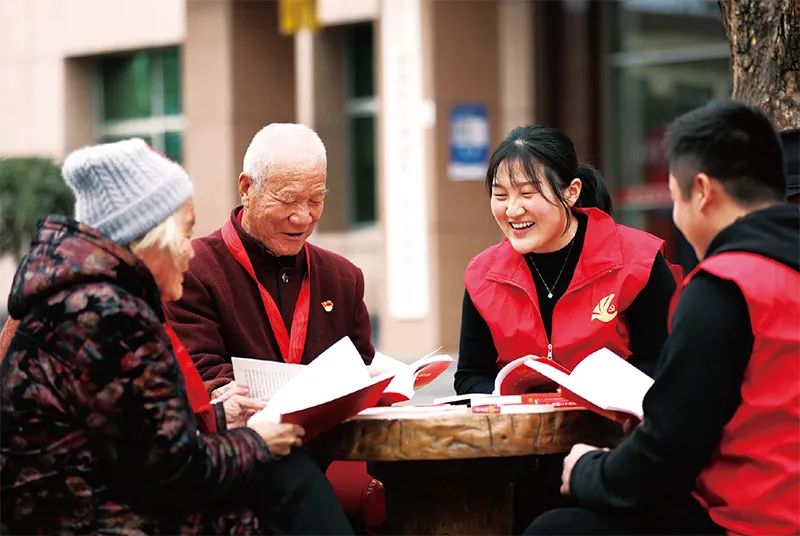 ?圖為2022年11月18日,山東省臨沂市郯城縣郯城街道“90后”青年黨員志愿者與龍泉社區(qū)“40后”老黨員一起學(xué)習(xí)黨的二十大精神。 人民圖片 張春雷/攝