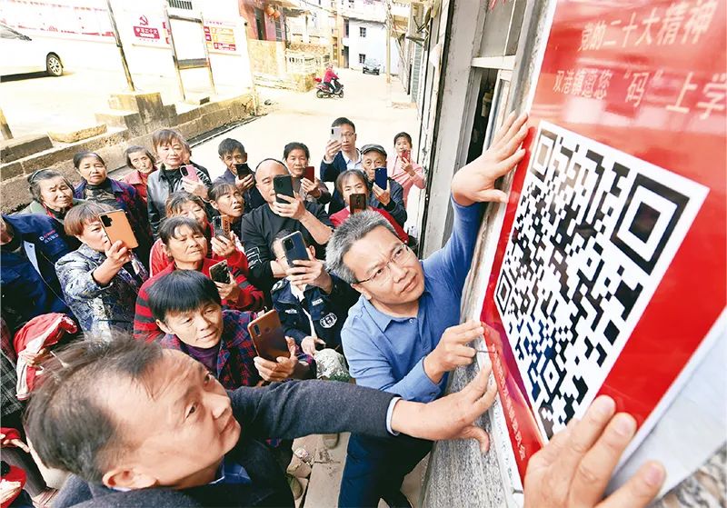 ?圖為2022年11月13日,江西省鄱陽(yáng)縣雙港鎮(zhèn)黨員干部將宣講黨的二十大精神的二維碼貼在村頭,吸引不少村民前來(lái)掃碼學(xué)習(xí)了解有關(guān)知識(shí)。 中新社發(fā) 卓忠偉/攝