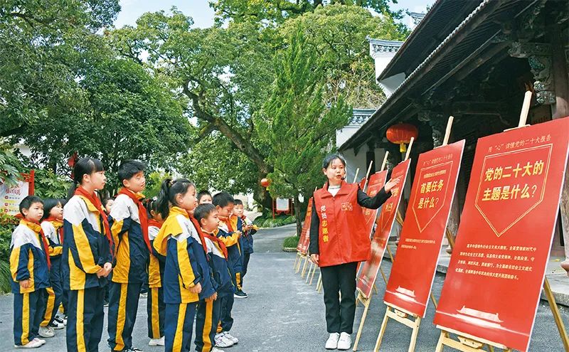 ?圖為2022年10月25日,浙江省臺(tái)州市上張鄉(xiāng)中心小學(xué)的學(xué)生在中共仙居縣委舊址紀(jì)念館學(xué)習(xí)黨的二十大精神。 人民視覺(jué) 王華斌/攝