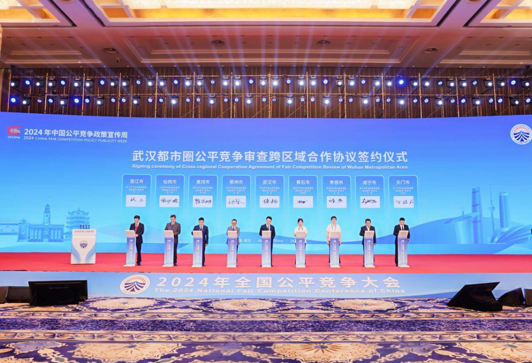 2024年9月10日至11日,由國(guó)家市場(chǎng)監(jiān)督管理總局主辦的2024年全國(guó)公平競(jìng)爭(zhēng)大會(huì)在湖北省武漢市舉行,大會(huì)主題為“統(tǒng)一大市場(chǎng) 公平競(jìng)未來(lái)”。圖為9月11日,武漢、黃石、鄂州、孝感、黃岡、咸寧、天門(mén)、仙桃、潛江等9個(gè)城市代表,現(xiàn)場(chǎng)簽訂公平競(jìng)爭(zhēng)審查跨區(qū)域合作協(xié)議。? ?湖北省市場(chǎng)監(jiān)管局供圖