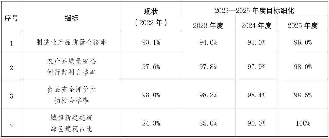 到2025年,新產(chǎn)品、新業(yè)態(tài)蓬勃發(fā)展,產(chǎn)品、工程、服務(wù)質(zhì)量水平顯著改善,制造業(yè)產(chǎn)品質(zhì)量合格率提高到96%,農(nóng)產(chǎn)品質(zhì)量安全例行監(jiān)測合格率達(dá)到98%以上,食品安全評價(jià)性抽檢合格率保持在98.5%以上,工程質(zhì)量抽查符合率不斷提高,城鎮(zhèn)新建建筑綠色建筑占比達(dá)到100%。