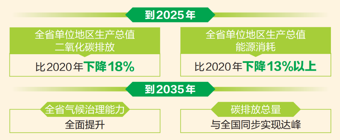 ?根據(jù)《規(guī)劃》,到2025年,全省單位地區(qū)生產(chǎn)總值二氧化碳排放比2020年下降18%,全省單位地區(qū)生產(chǎn)總值能源消耗比2020年下降13%以上。產(chǎn)業(yè)結(jié)構(gòu)和能源結(jié)構(gòu)進一步優(yōu)化、適應(yīng)氣候變化能力不斷提升、試點示范取得顯著進展、氣候治理能力取得重要成果?!兑?guī)劃》展望了2035年遠(yuǎn)景目標(biāo)。2035年全省氣候治理能力全面提升,碳排放總量已與全國同步實現(xiàn)達峰,經(jīng)濟社會已穩(wěn)步進入高質(zhì)量發(fā)展階段,中國最美麗省份全面建成。