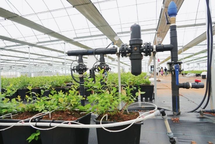 園區(qū)打造了省內(nèi)領(lǐng)先的水肥一體化灌溉中心,引入全省首臺(tái)以色列5G智能施肥系統(tǒng),并配套兩臺(tái)4G施肥系統(tǒng),實(shí)現(xiàn)對(duì)約500畝藍(lán)莓基地的遠(yuǎn)程精準(zhǔn)水肥管控。通過智能監(jiān)測與動(dòng)態(tài)調(diào)配,確保藍(lán)莓生長各階段精準(zhǔn)攝入所需營養(yǎng),有效促進(jìn)花芽發(fā)育與果實(shí)飽滿度提升,為高品質(zhì)產(chǎn)出提供核心技術(shù)支撐。自主開發(fā)光纖通信和物聯(lián)網(wǎng)智慧農(nóng)業(yè)平臺(tái),空氣成分、風(fēng)力、溫度、濕度、pH值等數(shù)據(jù)通過傳感器接入平臺(tái),平臺(tái)根據(jù)數(shù)據(jù)設(shè)定情況自主開關(guān)大棚通風(fēng)系統(tǒng)、遮陽系統(tǒng)、水肥灌溉等。