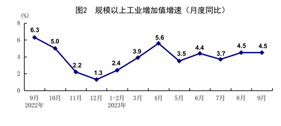 前三季度,全國規(guī)模以上工業(yè)增加值同比增長4.0%,比上半年加快0.2個百分點。分三大門類看,采礦業(yè)增加值同比增長1.7%,制造業(yè)增長4.4%,電力、熱力、燃?xì)饧八a(chǎn)和供應(yīng)業(yè)增長3.5%。裝備制造業(yè)增加值增長6.0%,比全部規(guī)模以上工業(yè)快2.0個百分點。分經(jīng)濟類型看,國有控股企業(yè)增加值同比增長4.6%;股份制企業(yè)增長4.8%,外商及港澳臺商投資企業(yè)增長0.5%;私營企業(yè)增長2.3%。分產(chǎn)品看,太陽能電池、充電樁、新能源汽車產(chǎn)量分別增長63.2%、34.2%、26.7%。9月份,規(guī)模以上工業(yè)增加值同比增長4.5%,增速與上月持平,比7月份加快0.8個百分點;環(huán)比增長0.36%。1-8月份,全國規(guī)模以上工業(yè)企業(yè)實現(xiàn)利潤總額同比下降11.7%,降幅比上半年收窄5.1個百分點,其中8月份同比增長17.2%。9月份,制造業(yè)采購經(jīng)理指數(shù)為50.2%,比上月上升0.5個百分點,企業(yè)生產(chǎn)經(jīng)營活動預(yù)期指數(shù)為55.5%。