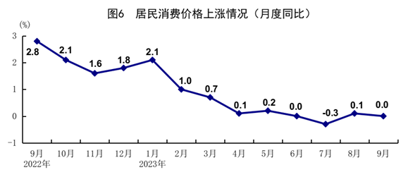 前三季度,全國居民消費價格(CPI)同比上漲0.4%。分類別看,食品煙酒價格上漲1.1%,衣著價格上漲0.9%,居住價格下降0.1%,生活用品及服務(wù)價格上漲0.2%,交通通信價格下降2.4%,教育文化娛樂價格上漲1.9%,醫(yī)療保健價格上漲1.1%,其他用品及服務(wù)價格上漲3.2%。在食品煙酒價格中,豬肉價格下降6.8%,鮮菜價格下降3.1%,糧食價格上漲1.2%,鮮果價格上漲6.0%。扣除食品和能源價格后的核心CPI同比上漲0.7%。9月份,全國居民消費價格同比持平,環(huán)比上漲0.2%。