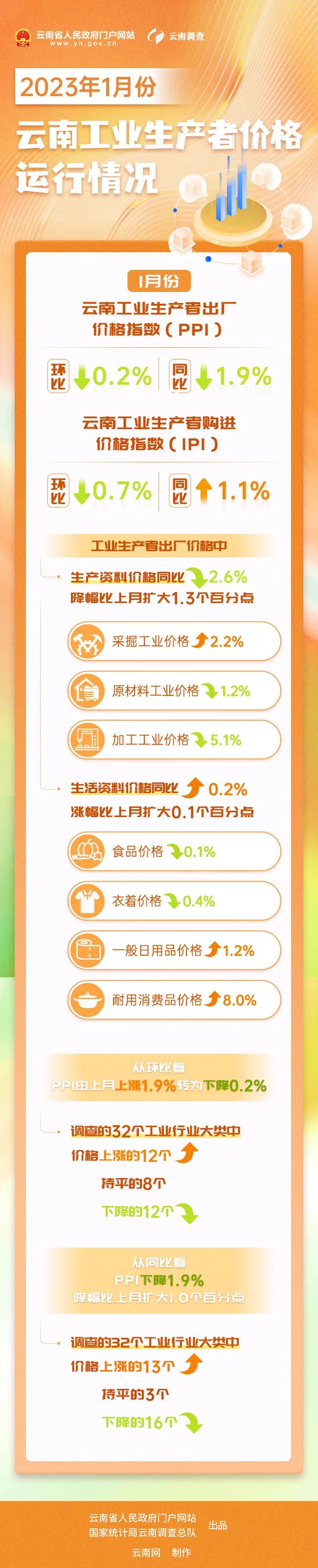 國(guó)家統(tǒng)計(jì)局云南調(diào)查總隊(duì)根據(jù)國(guó)家現(xiàn)行統(tǒng)計(jì)調(diào)查制度規(guī)定依法開(kāi)展的工業(yè)生產(chǎn)者價(jià)格調(diào)查結(jié)果顯示:2023年1月份,受國(guó)際原油價(jià)格波動(dòng)和國(guó)內(nèi)煤炭?jī)r(jià)格下行等因素影響,云南工業(yè)生產(chǎn)者出廠價(jià)格指數(shù)(PPI)環(huán)比下降0.2%,同比下降1.9%,降幅比上月擴(kuò)大1.0個(gè)百分點(diǎn);購(gòu)進(jìn)價(jià)格指數(shù)(IPI)環(huán)比下降0.7%,同比上漲1.1%,漲幅較上月回落0.9個(gè)百分點(diǎn)。