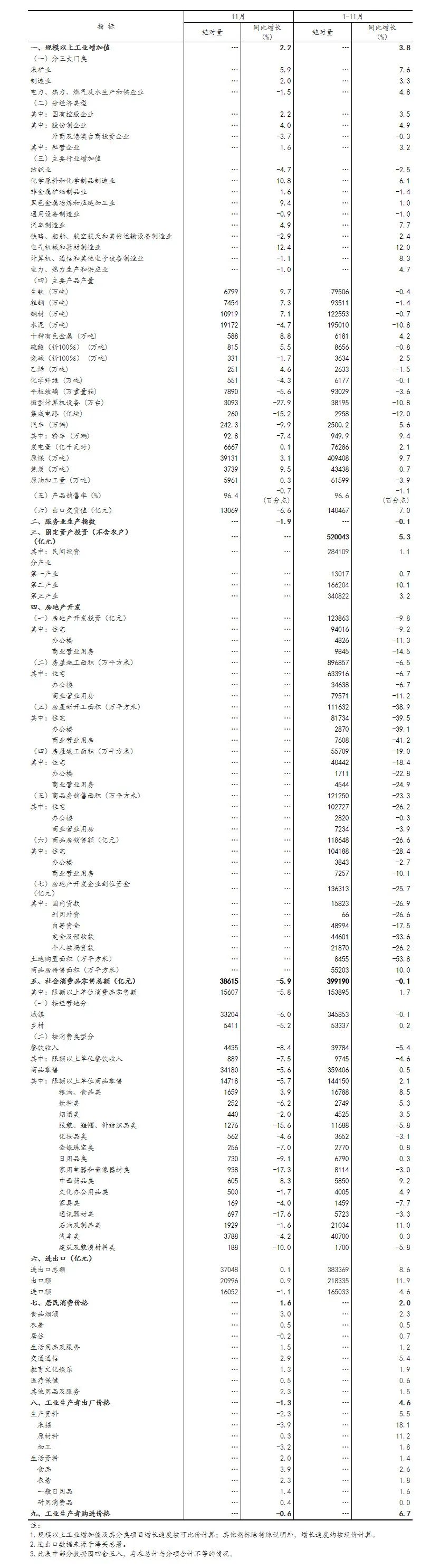 ?1-11月份,全國規(guī)模以上工業(yè)增加值同比增長3.8%。分三大門類看,采礦業(yè)增加值同比增長7.6%,制造業(yè)增長3.3%,電力、熱力、燃?xì)饧八a(chǎn)和供應(yīng)業(yè)增長4.8%。高技術(shù)制造業(yè)增加值同比增長8.0%。分經(jīng)濟(jì)類型看,國有控股企業(yè)增加值同比增長3.5%;股份制企業(yè)增長4.9%,外商及港澳臺商投資企業(yè)下降0.3%;私營企業(yè)增長3.2%。分產(chǎn)品看,新能源汽車、太陽能電池、移動通信基站設(shè)備等綠色智能產(chǎn)品產(chǎn)量同比分別增長100.5%、44.1%、22.2%。11月份,全國規(guī)模以上工業(yè)增加值同比增長2.2%,環(huán)比下降0.31%。其中,采礦業(yè)增加值同比增長5.9%,制造業(yè)增長2.0%,電力、熱力、燃?xì)饧八a(chǎn)和供應(yīng)業(yè)下降1.5%。11月份,制造業(yè)采購經(jīng)理指數(shù)為48.0%。1-10月份,全國規(guī)模以上工業(yè)企業(yè)實(shí)現(xiàn)利潤總額69768億元,同比下降3.0%。