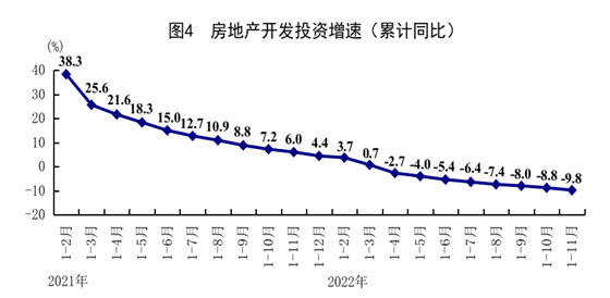 ?1-11月份,全國固定資產(chǎn)投資(不含農(nóng)戶)520043億元,同比增長5.3%。分領(lǐng)域看,基礎(chǔ)設(shè)施投資同比增長8.9%,制造業(yè)投資增長9.3%,房地產(chǎn)開發(fā)投資下降9.8%。全國商品房銷售面積121250萬平方米,同比下降23.3%;商品房銷售額118648億元,下降26.6%。分產(chǎn)業(yè)看,第一產(chǎn)業(yè)投資同比增長0.7%,第二產(chǎn)業(yè)投資增長10.1%,第三產(chǎn)業(yè)投資增長3.2%。民間投資增長1.1%。高技術(shù)產(chǎn)業(yè)投資增長19.9%,其中高技術(shù)制造業(yè)和高技術(shù)服務(wù)業(yè)投資分別增長23.0%、13.2%。高技術(shù)制造業(yè)中,醫(yī)療儀器設(shè)備及儀器儀表制造業(yè)、電子及通信設(shè)備制造業(yè)投資分別增長28.3%、28.2%;高技術(shù)服務(wù)業(yè)中,科技成果轉(zhuǎn)化服務(wù)業(yè)、電子商務(wù)服務(wù)業(yè)、研發(fā)設(shè)計(jì)服務(wù)業(yè)投資分別增長26.1%、24.4%、21.2%。社會領(lǐng)域投資增長12.5%,其中衛(wèi)生、教育投資分別增長29.3%、7.5%。11月份,固定資產(chǎn)投資(不含農(nóng)戶)環(huán)比下降0.87%。