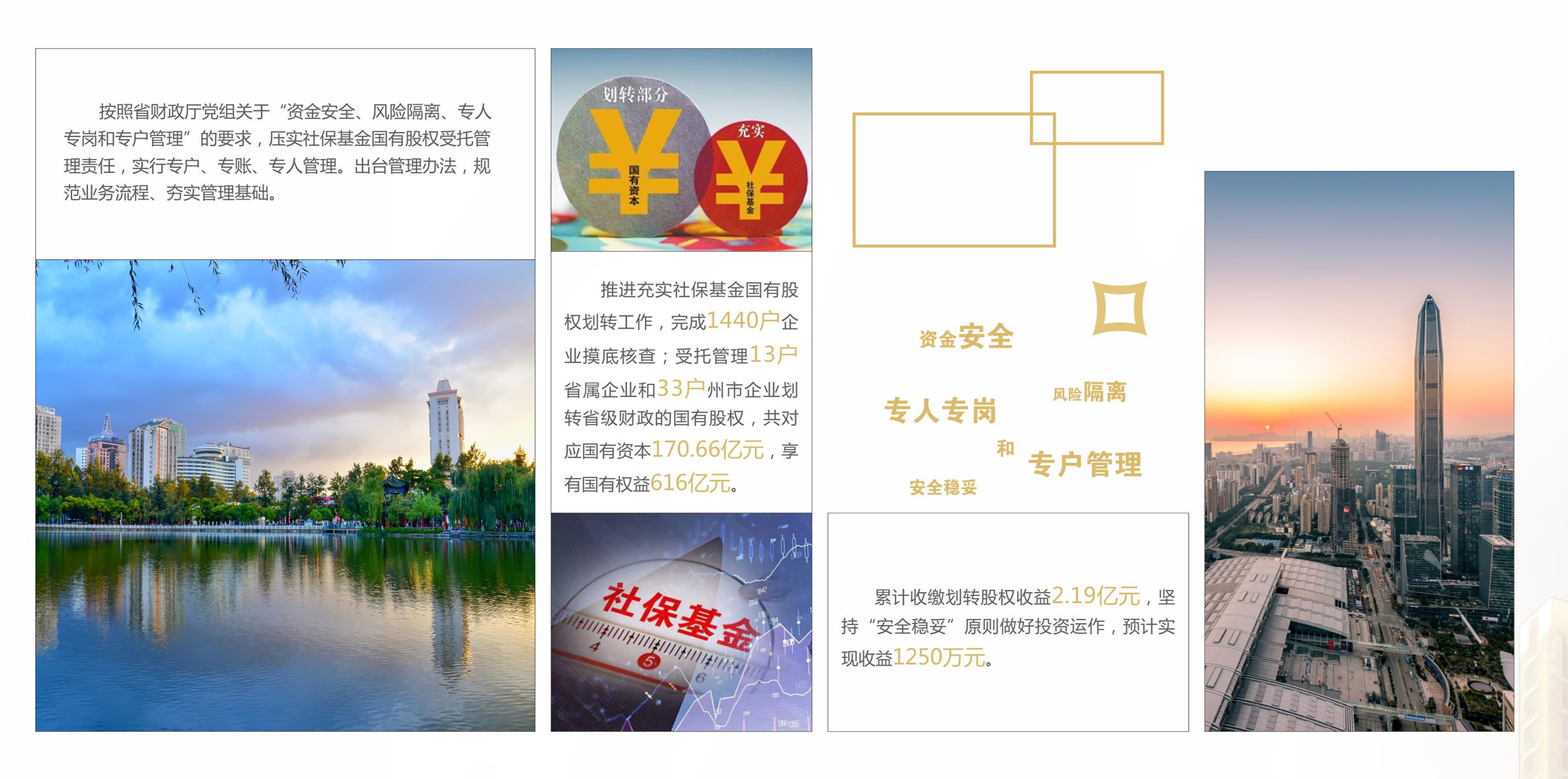 按照省財政廳黨組“資金安全、風(fēng)險隔離、專人專崗和專戶管理”的要求,集團(tuán)緊扣職能定位,加強統(tǒng)籌謀劃,單獨成立社保資產(chǎn)管理中心,壓實受托管理責(zé)任。聚焦劃轉(zhuǎn)股權(quán)后續(xù)管理,積極構(gòu)建“1+2+4”管理制度體系,規(guī)范業(yè)務(wù)流程、夯實管理基礎(chǔ)。全國首家出臺專戶會計核算辦法,嚴(yán)格實行專戶、專賬、專人管理,確保資金安全。完成1440戶企業(yè)摸底核查,受托管理13戶省屬企業(yè)和33戶州市企業(yè)劃轉(zhuǎn)省級財政的國有股權(quán),共對應(yīng)國有資本171億元,享有國有權(quán)益616億元。累計收取分紅收益3.16億元,按照“安全穩(wěn)妥、兼顧收益”原則,全部完成投資運作,預(yù)計到期收益3287萬元。
